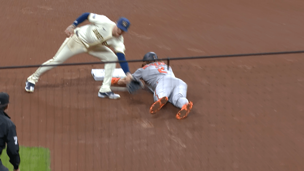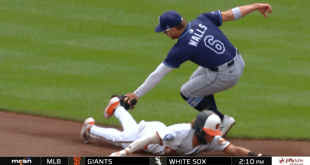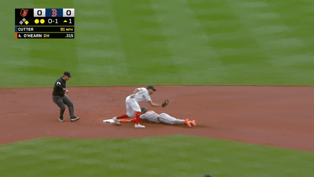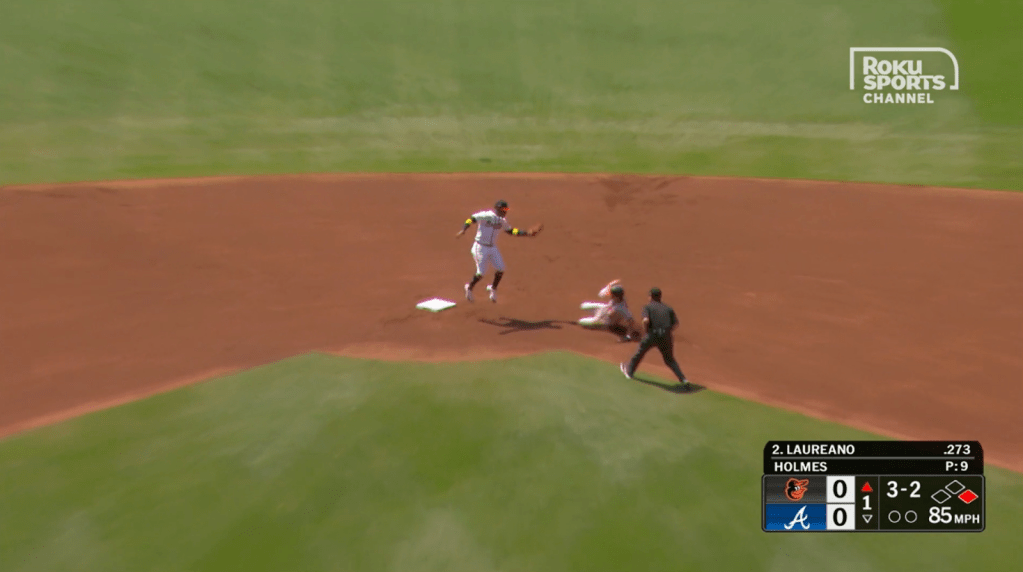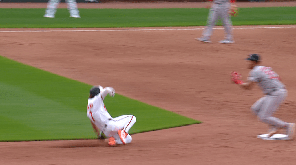 The first caught stealing came in the O’s second series of the season. This is one I would put in the bucket of a bad slide.