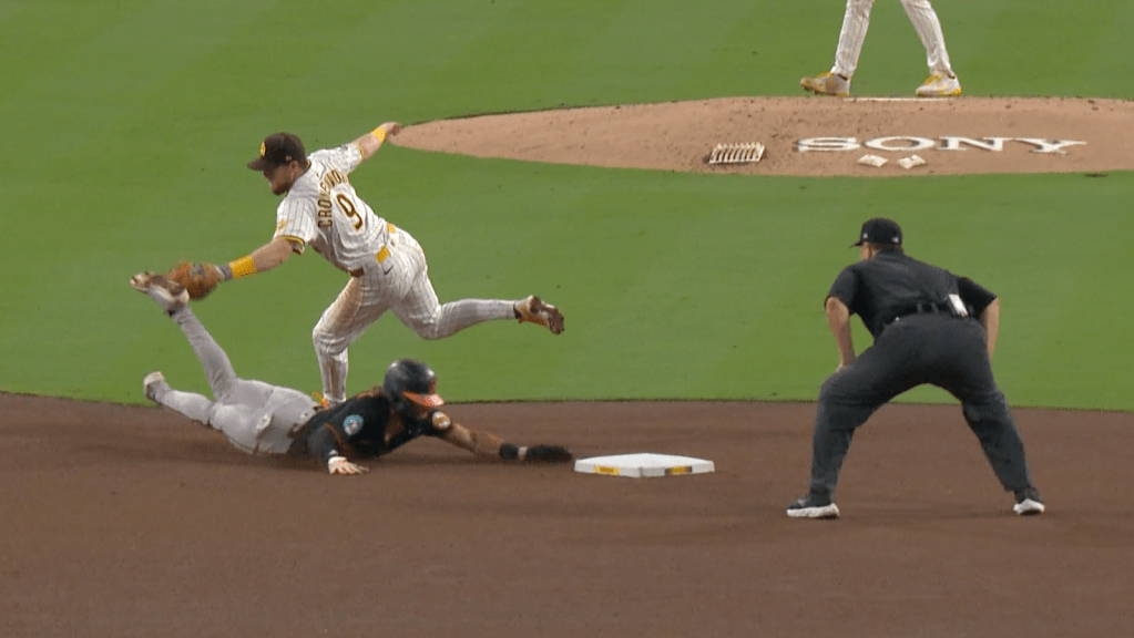 Another crazy foot tag?? The jump Holliday gets off Darvish is fine and the throw from Fermin is off line and Cronenworth just makes a great play. I suppose you could fault Holliday for having his foot way up in the air where Cronenworth could very easily tag it but again when you’re sliding into the base headfirst it’s hard to have the presence of mind to think I better make sure the defender doesn’t tag my foot.