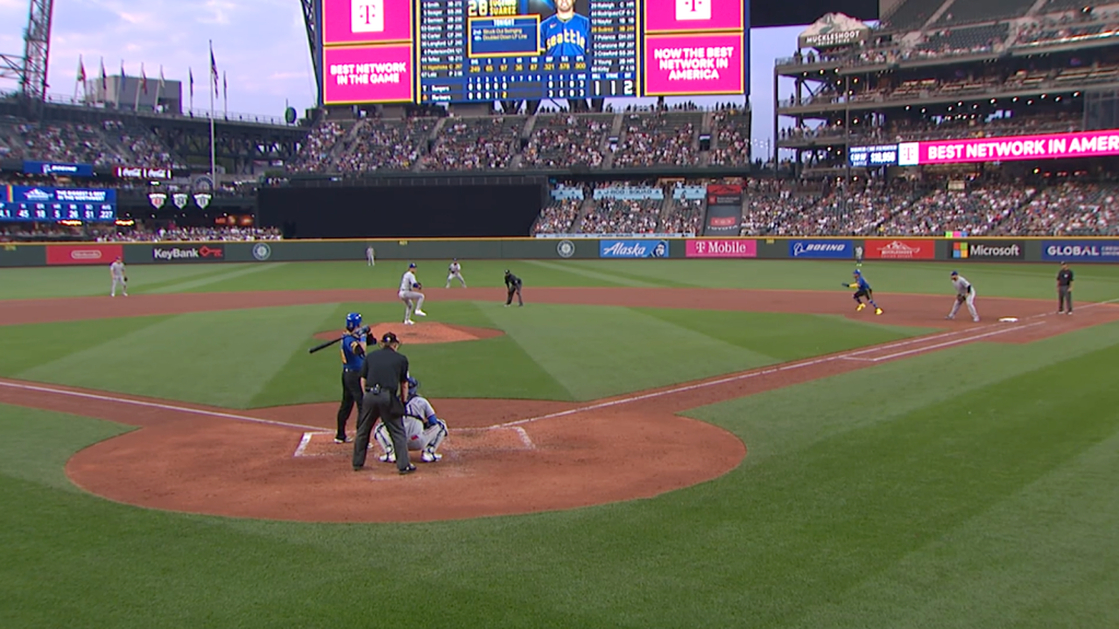 Here he is as the ball leaves the hand. This isn’t a great jump but considering that he’s running on a lefty, Newcomb tops out at 94 mph and Wong is below average when it comes to throwing runners out, I’d call this a competitive jump.