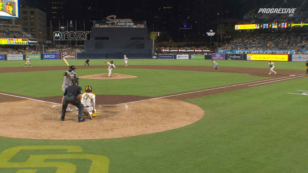 He’s running on a righty and gets a good pitch to run on, in fact it’s the second slowest pitch he runs on all year and he’s out pretty convincingly. To Hedges’ credit it’s a really good throw.