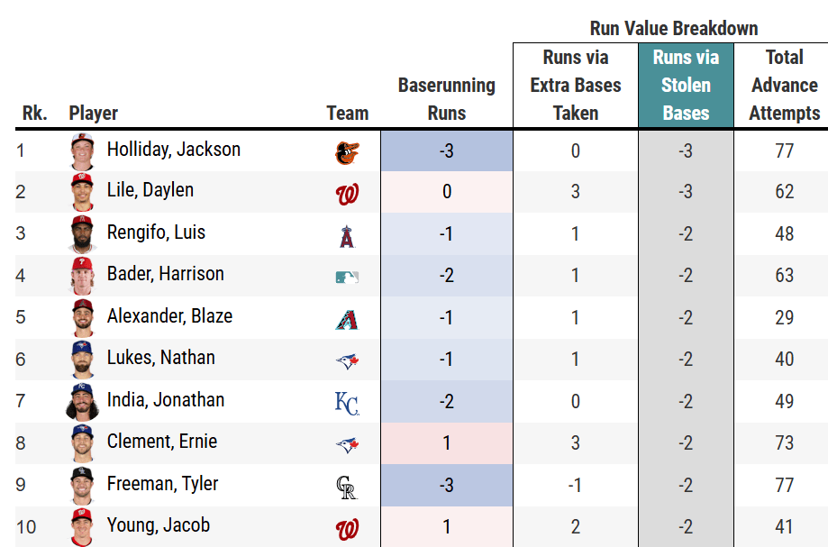 To figure this out I decided to look at a couple of the better base stealers in the league who don’t have an obvious speed advantage over Holliday. Those players are Josh Naylor, Juan Soto, Cedric Mullins and Gunnar Henderson.