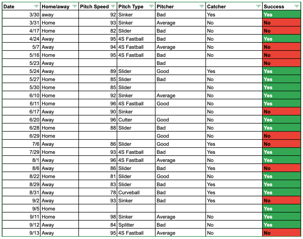 You’ll notice there’s a couple missing rows of data. Those are special instances. One where Holliday was caught stealing by the pitcher stepping off, one where statcast was down so there was no pitch data and one where it was pretty much a wild pitch but the scorekeeper was generous and gave Holliday a stolen base. (Not to shade Holliday at all, he actually scored from second on the wild pitch. It was one of his best plays of the season)