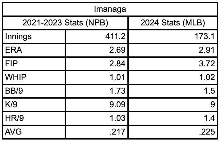 Out of everyone that has recently come over Imanaga came the closest to replicating his NPB stats in the States. However now that we’ve seen a second year from Shota it would appear the aging curve caught up with him rather quickly.