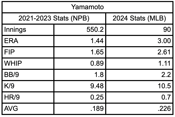 Yamamoto’s first year MLB numbers are a bit skewed because he dealt with injury but they were still pretty good and he was their best starter on a World Series team. Even though it’s not in the little chart I made, we also know what Yamamoto did in 2025 which was very impressive.
