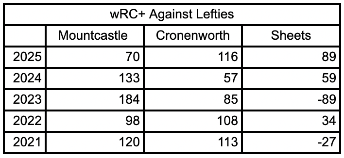Here’s Mountcastle’s splits against lefties over the past 5 seasons compared to Cronenworth and Sheets.